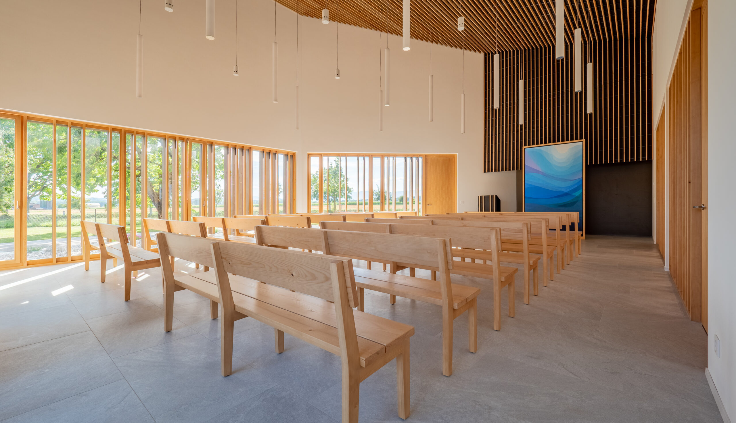 Notre architecte, Véronique, a choisi des matériaux simples tels que le bois d’épicéa grisé à l’extérieur et naturel à l’intérieur pour sa couleur orangée afin d’apporter chaleur et lumière. Le bâtiment est conçu en transparence filtrée par des claustras, ce qui permet une vue apaisante sur le jardin tout en maintenant l’intimité de l’espace intérieur. Le grand hall permet de se retrouver avant ou après une cérémonie. Il est également équipé de haut-parleurs permettant de suivre la cérémonie lorsque la capacité de la chapelle n’est pas suffisante.