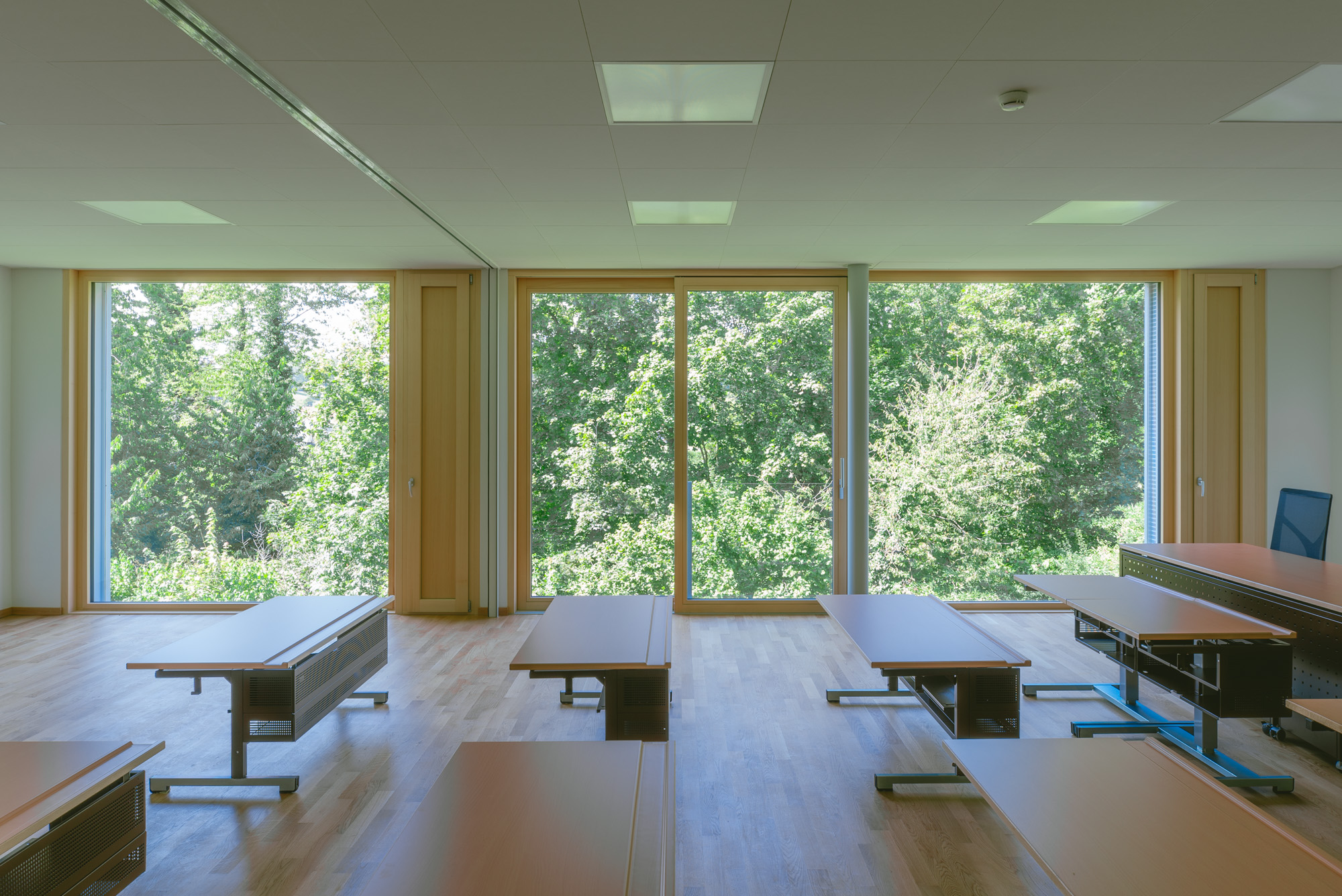 Soucieuse de durabilité, l’extension bénéficie d’un système énergétique performant utilisant la chaleur produite par la centrale de plaquettes de bois du complexe scolaire. La ventilation double-flux, les installations sanitaires optimisées et le traitement complet de l’eau garantissent un confort optimal pour les élèves comme pour l’équipe éducative.