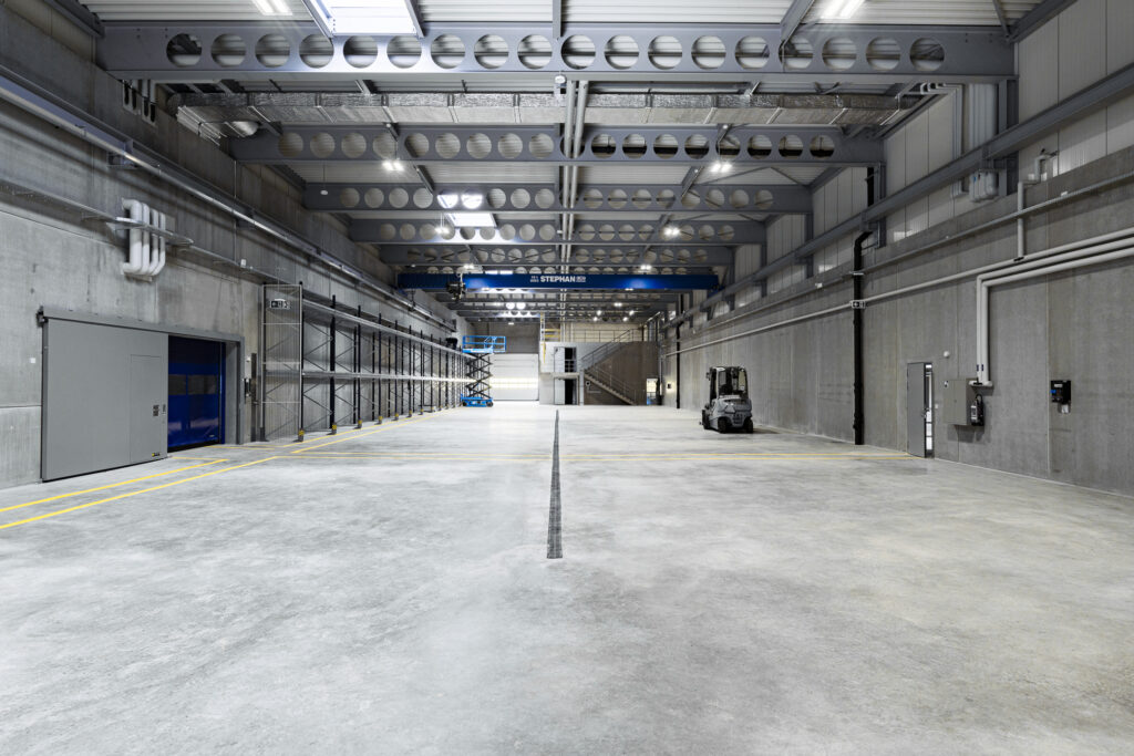 Développé sur une surface de 7’000 m² pour un volume de 40’000 m³, le bâtiment accueille des bureaux modernes, des espaces de stockage, un parking ainsi que des zones dédiées au stationnement de véhicules de service.