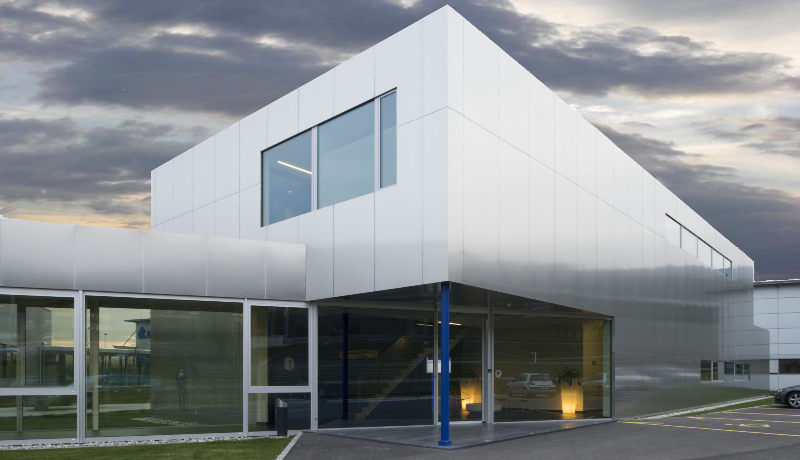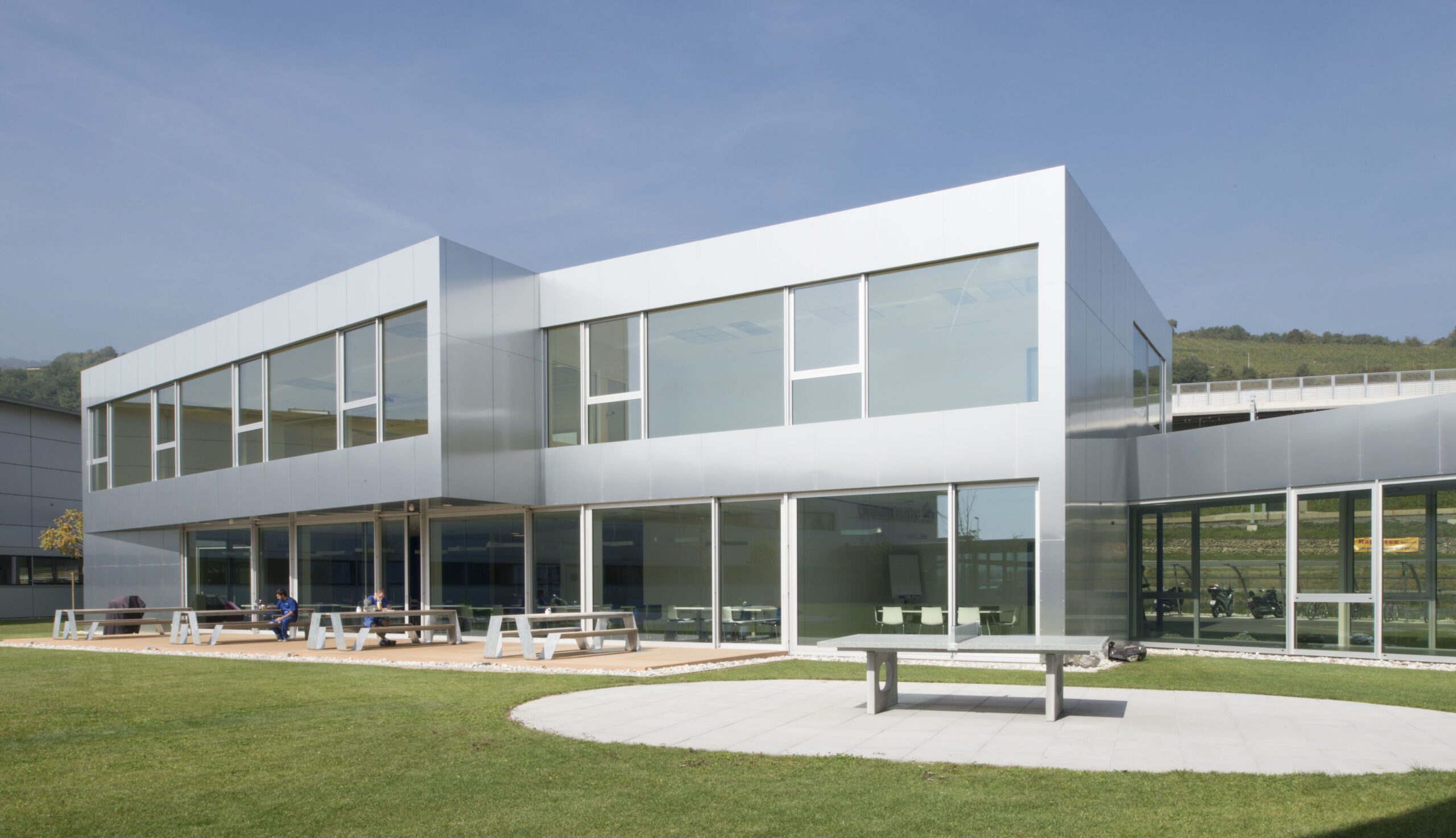 Ce bâtiment, aux façades habillées d’un revêtement aluminium, se distingue des 2 volumes environnants par la finesse et le soin apporté à ses façades. Il se niche dans l’espace résiduel séparant les 2 unités de production, avec un aperçu sur le patio, îlot de verdure et de tranquillité.